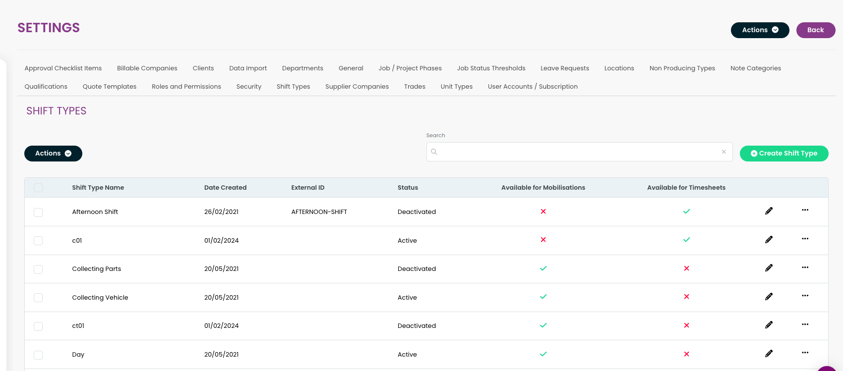 - A search filter has been added to help you quickly locate specific shift types. You can filter by shift type name, whether it's applied to mobilizing or pay rates, and more.